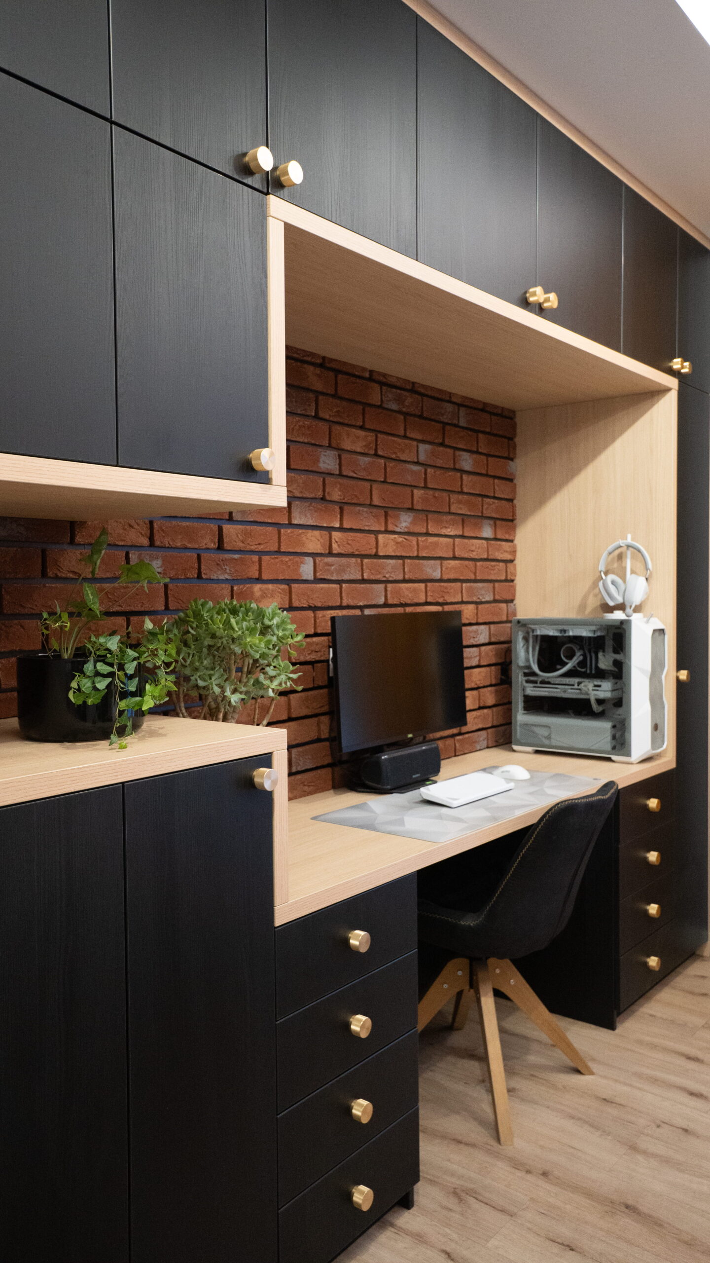 Riešenie elektrickej a počítačovej kabeláže bolo premyslene zakomponované do dizajnu – všetky káble sú elegantne skryté za stenou z tehličiek, čím je zachovaný čistý, minimalistický vzhľad pracovnej plochy a zároveň je zabezpečená praktickosť a bezpečnosť.