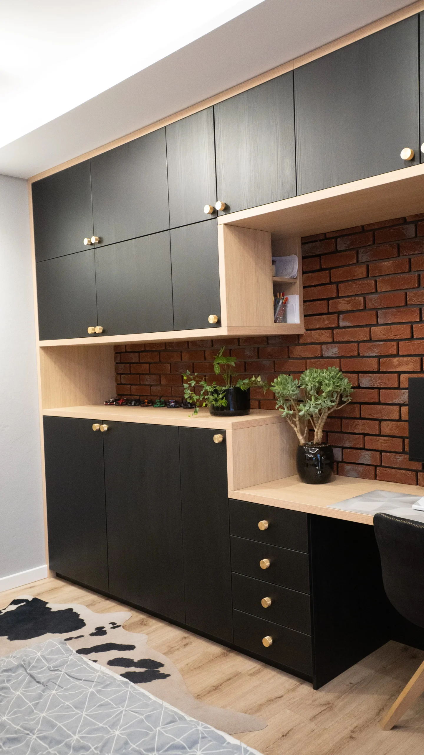 Chlapčenská izba v odvážnom čierno-drevenom prevedení predstavuje spojenie moderného dizajnu, funkčnosti a precízneho spracovania. Tmavé tóny v kombinácii s prirodzenou textúrou dreva vytvárajú nadčasový a štýlový interiér, ktorý pôsobí sofistikovane a zároveň príjemne zútulňuje priestor.