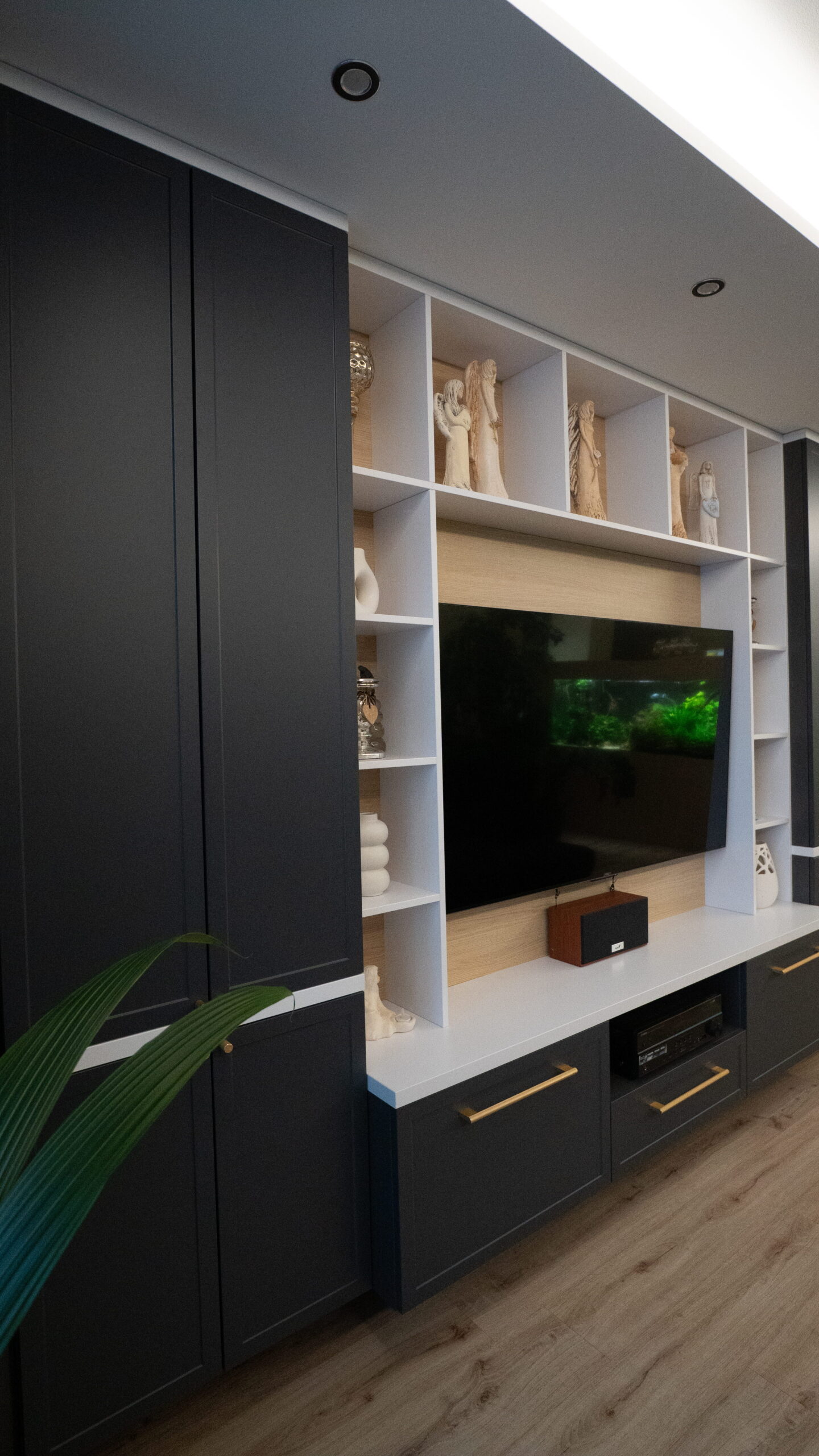 Uzatvorené skrinky ponúkajú veľkorysý úložný priestor, diskrétne ukrytý za minimalistickými plochami, zatiaľ čo otvorené police vytvárajú reprezentatívnu zónu pre knihy, umelecké objekty či dizajnové doplnky.