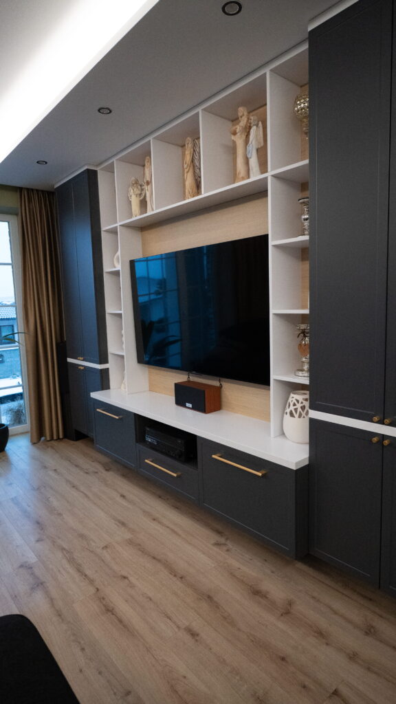 Pri realizácii obývacej steny bolo použité prémiové kovanie značky Blum, ktoré zaručuje precízny chod, spoľahlivosť a dlhodobú životnosť celej zostavy.